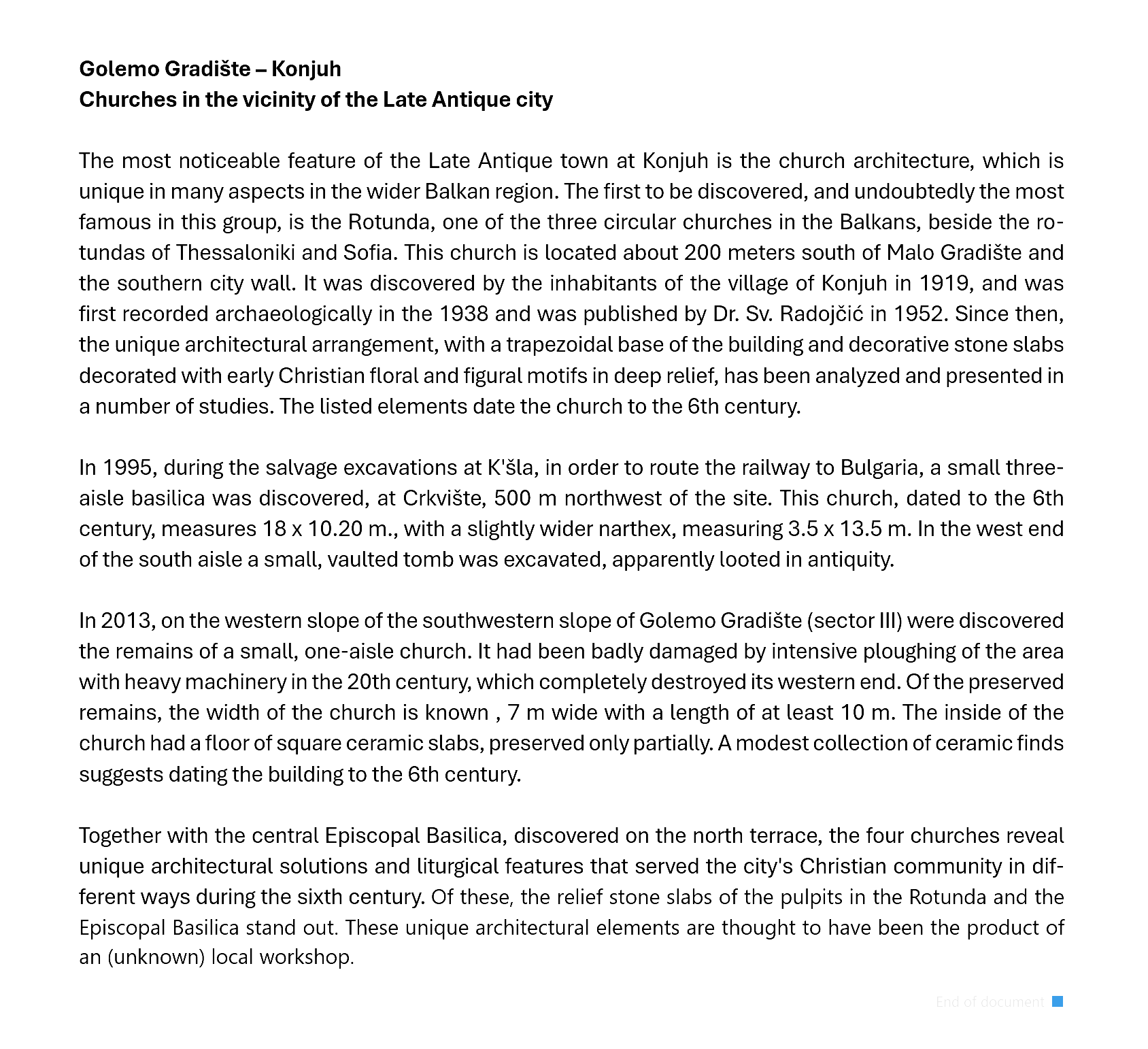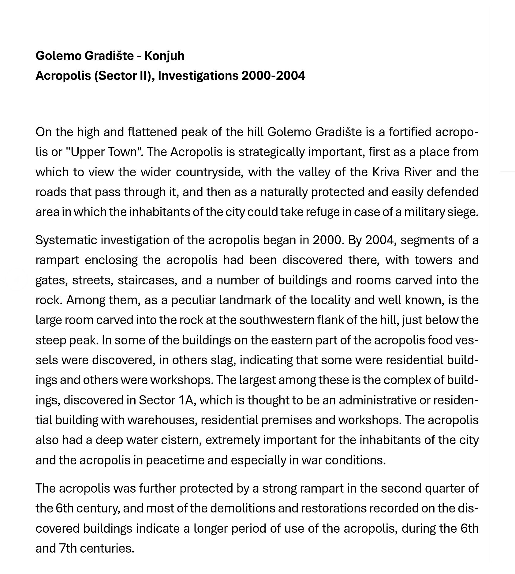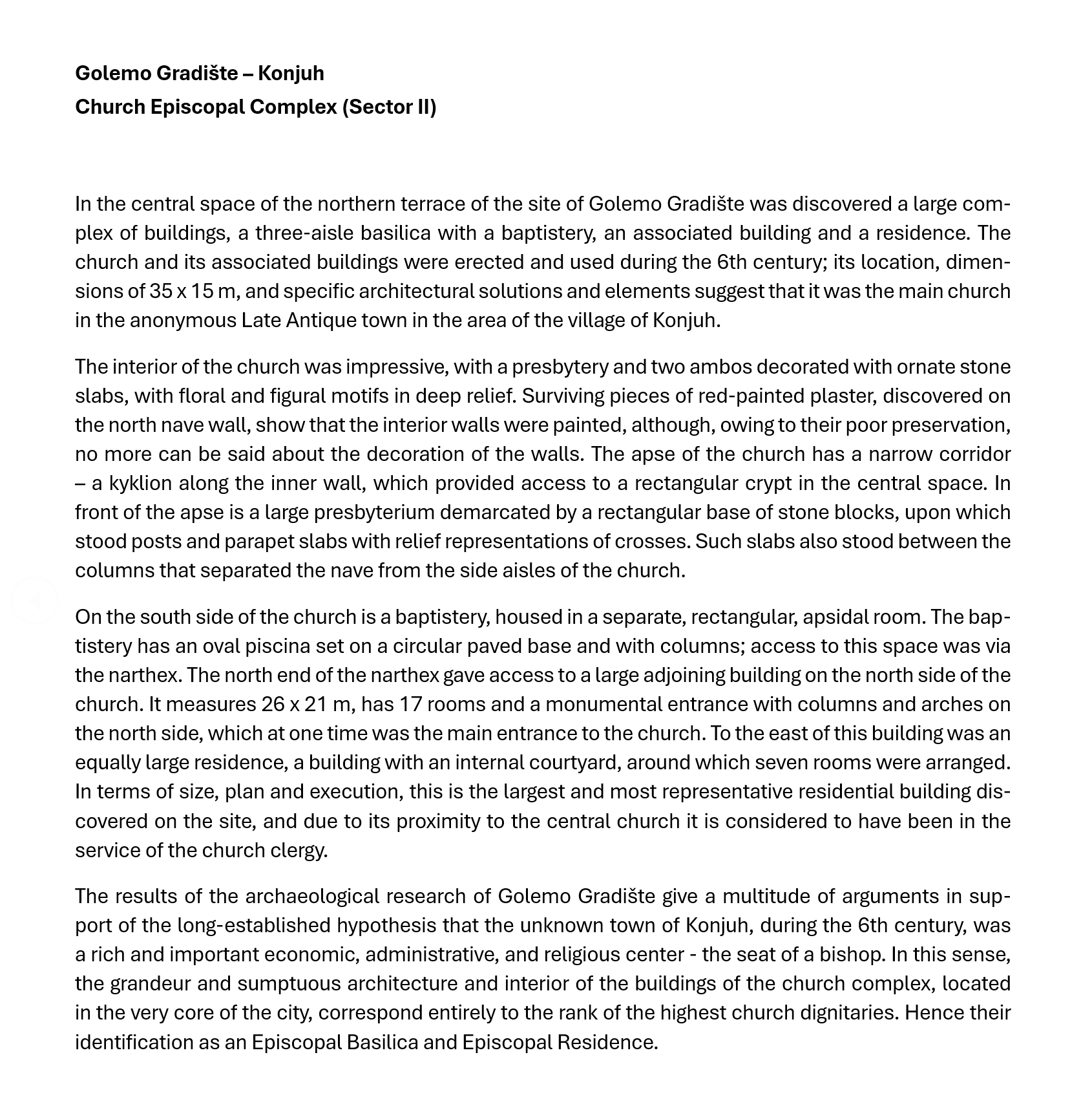 "Golemo Gradište" is the name of a high elongated hill along the southern bank of the Kriva River, in the area of the Kratovo village of Konjuh. On the flattened plateau at the top of the hill and at its foot are the remains of a large fortified town dating to Late Antiquity (5th-7th century). The first knowledge of the existence of this site was obtained in the first half of the 20th century, after the accidental discovery of the church "Rotunda", by the inhabitants of the village of Konjuh, in 1919, as well as from the numerous columns and worked stones, excavated from the site and built into some of the houses of the locals that can still be seen today.