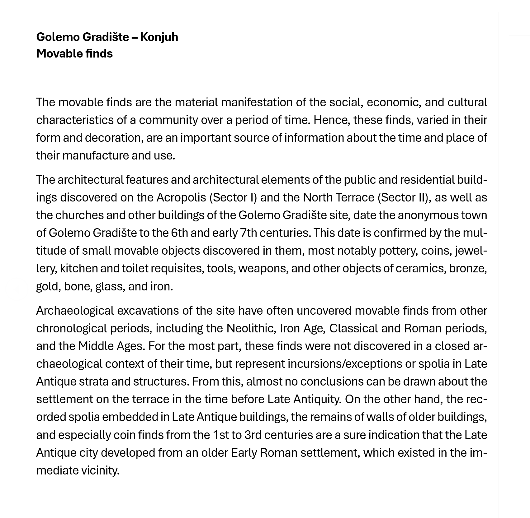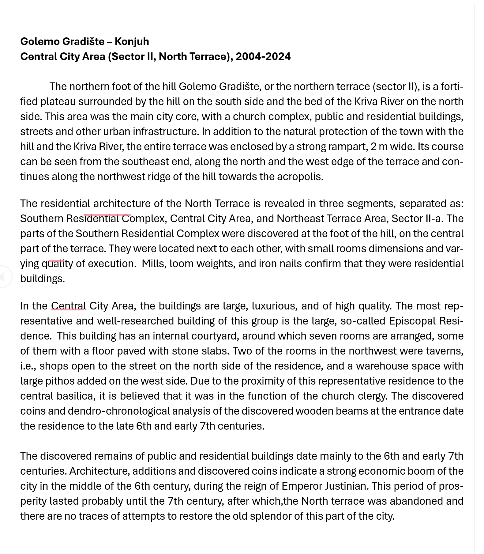 The site and its surroundings were inhabited from prehistoric times to the Middle Ages. On the northern residential terrace, under the remains of late Roman buildings, artifacts from the Neolithic, Iron Age and Classical periods have been discovered. There is not enough data for an early Roman phase of settlement on the northern terrace, which is why it is believed that the city was built in the late 5th or early 6th century. After years of prosperity the city suffered in military sieges by the Slavs, and by the beginning of the 7th century, the inhabitants had left this area, moving to the safety of the acropolis.